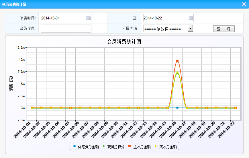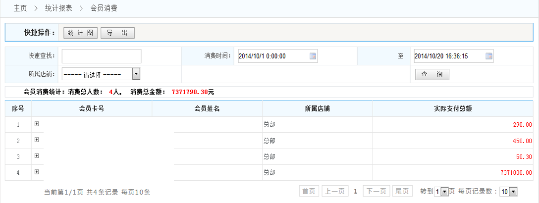 2.會員消費(fèi)統(tǒng)計(jì):將統(tǒng)計(jì)在滿足設(shè)定的條件下的所有消費(fèi)的概況