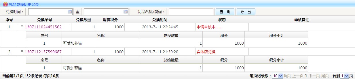 消費(fèi)記錄: 1.查詢:可以根據(jù)兌換單號 時間段 等條件查詢 2.導(dǎo)出:可以將按條件查詢出來的數(shù)據(jù),以Excel表格形式導(dǎo)出 3.列表:雙擊兌換單號,可以查看消費(fèi)詳情 (見下圖)