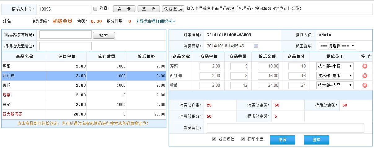 先會員刷卡,然后輸入商品的名稱或簡碼或者掃描槍快速定位查找商品;或者直接點擊商品選擇;選擇商品后點擊結算此訂單如圖顯示: